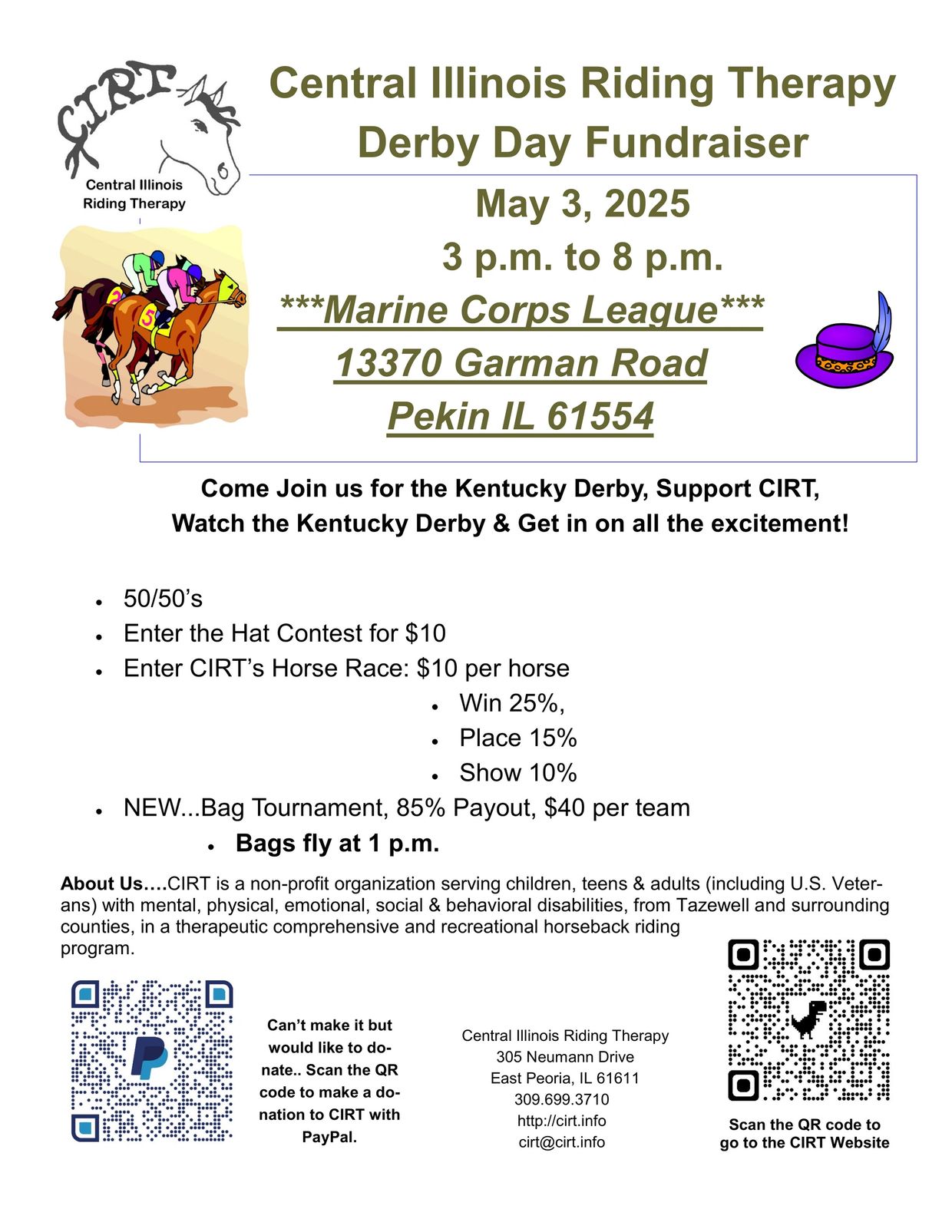 Thank you to all who came out and joined in celebrating the Kentucky Derby. Thank you to THe Farmhouse in Delavan for donating 10% of the food process to CIRT and to everyone who participated in our Hat Contest, 50/50 and our own Horse Race.